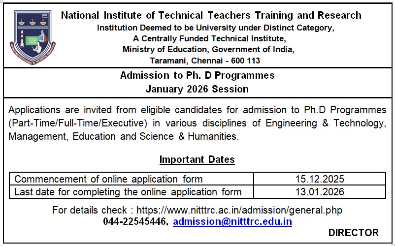 National Institute of Technical Teachers Training and Research (NITTTR) Chennai invites application for PhD Admission 2026 (Jan Session).